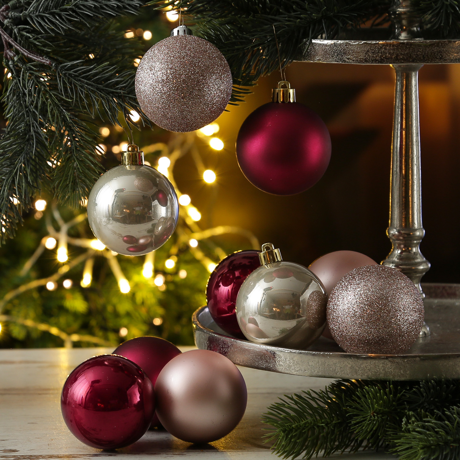 Die wunderschönen pink- und rosafarbenen Christbaumkugeln aus Kunststoff sorgen nicht nur am Weihnachtsbaum in Deiner Wohnung für eine festliche Stimmung. Die Baumkugeln sehen auch besonders gut als Deko für Fenster, Schalen und Glasgefäße aus. Aber auch im Adventskranz, in Adventssträußen oder Gestecken können die Christbaumkugeln hervorragend dekoriert werden.