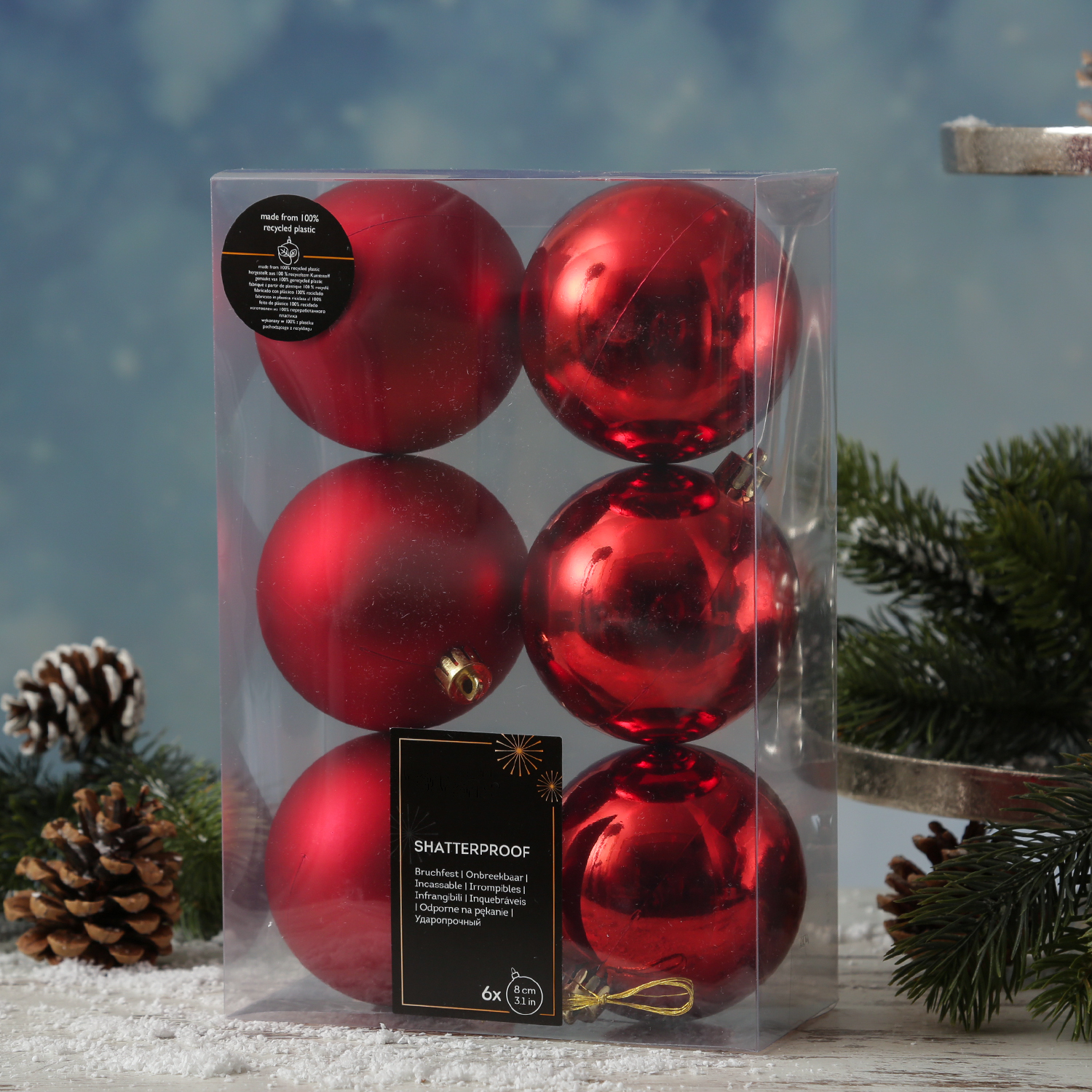 Die glänzenden und matten Baumkugeln sehen täuschend echt aus und sind einfach ein toller Blickfang in der Weihnachtszeit.
