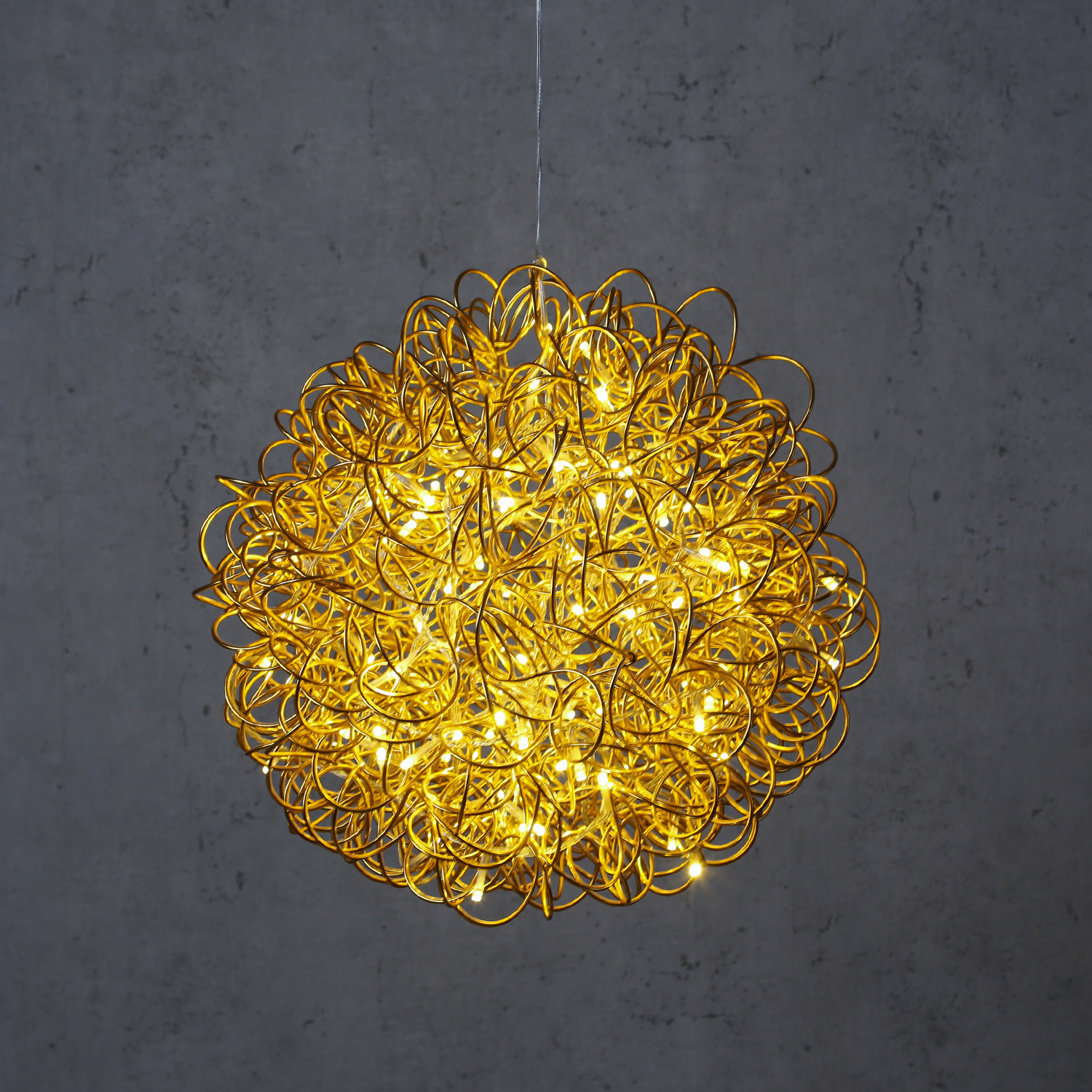 Das Licht der LED glitzert und reflektiert im Draht und lässt die Kugel hell erstrahlen.