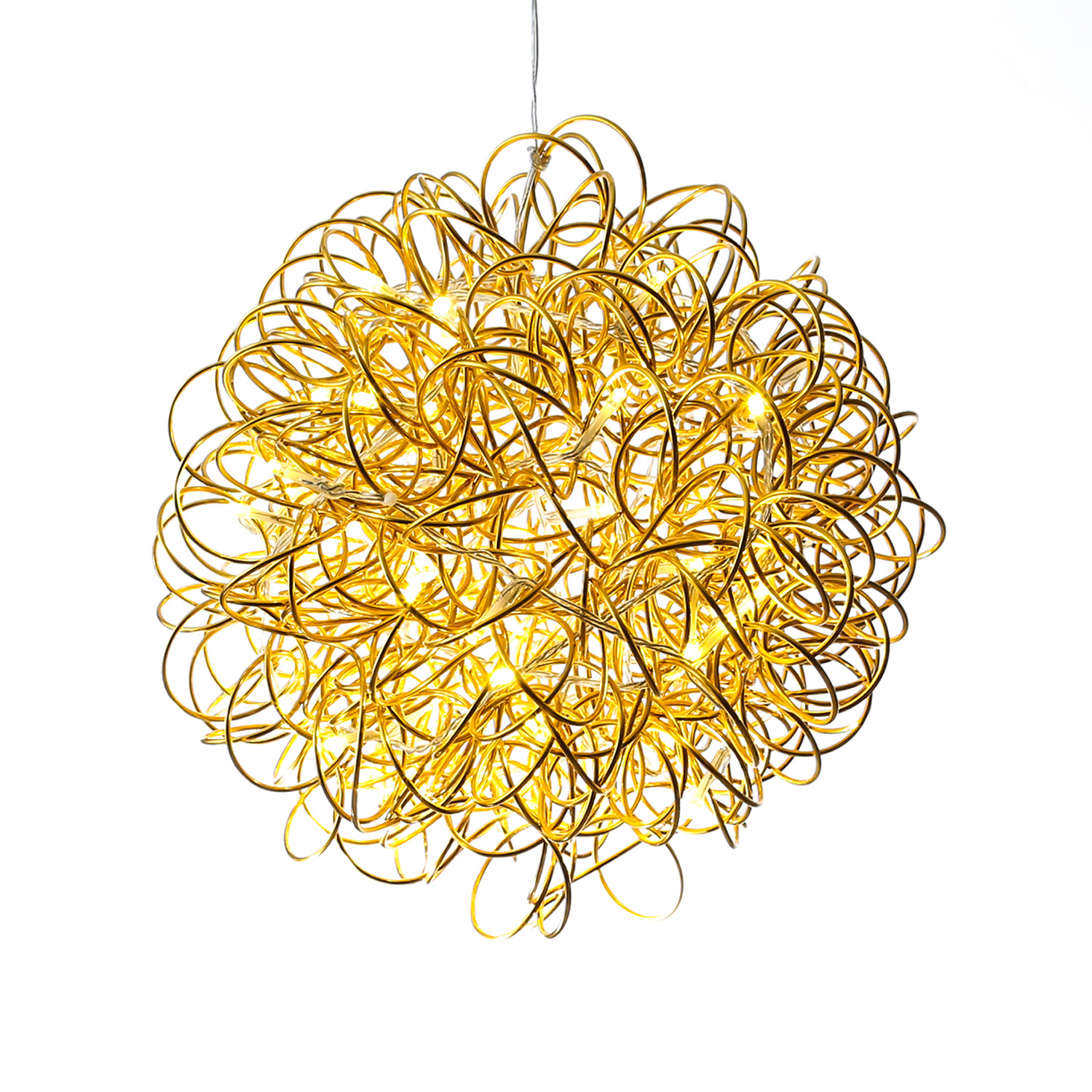 Diese besonders schöne LED Drahtkugel ist sowohl im Wohnraum als auch im Garten eine echte Augenweide. Die Kugel ist aus einem dicken goldenen Aluminiumdraht von Hand gewickelt. Dann wurde eine transparente Lichterkette mit 100 warmweiß leuchtenden LED eingewoben.