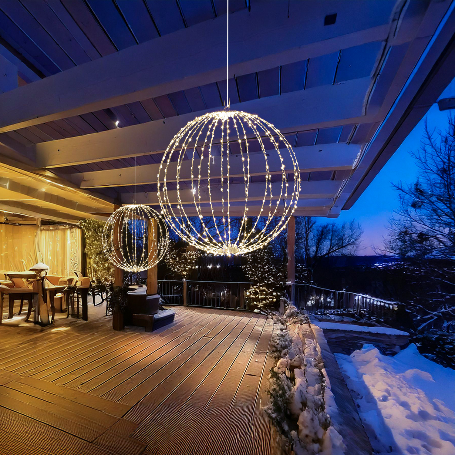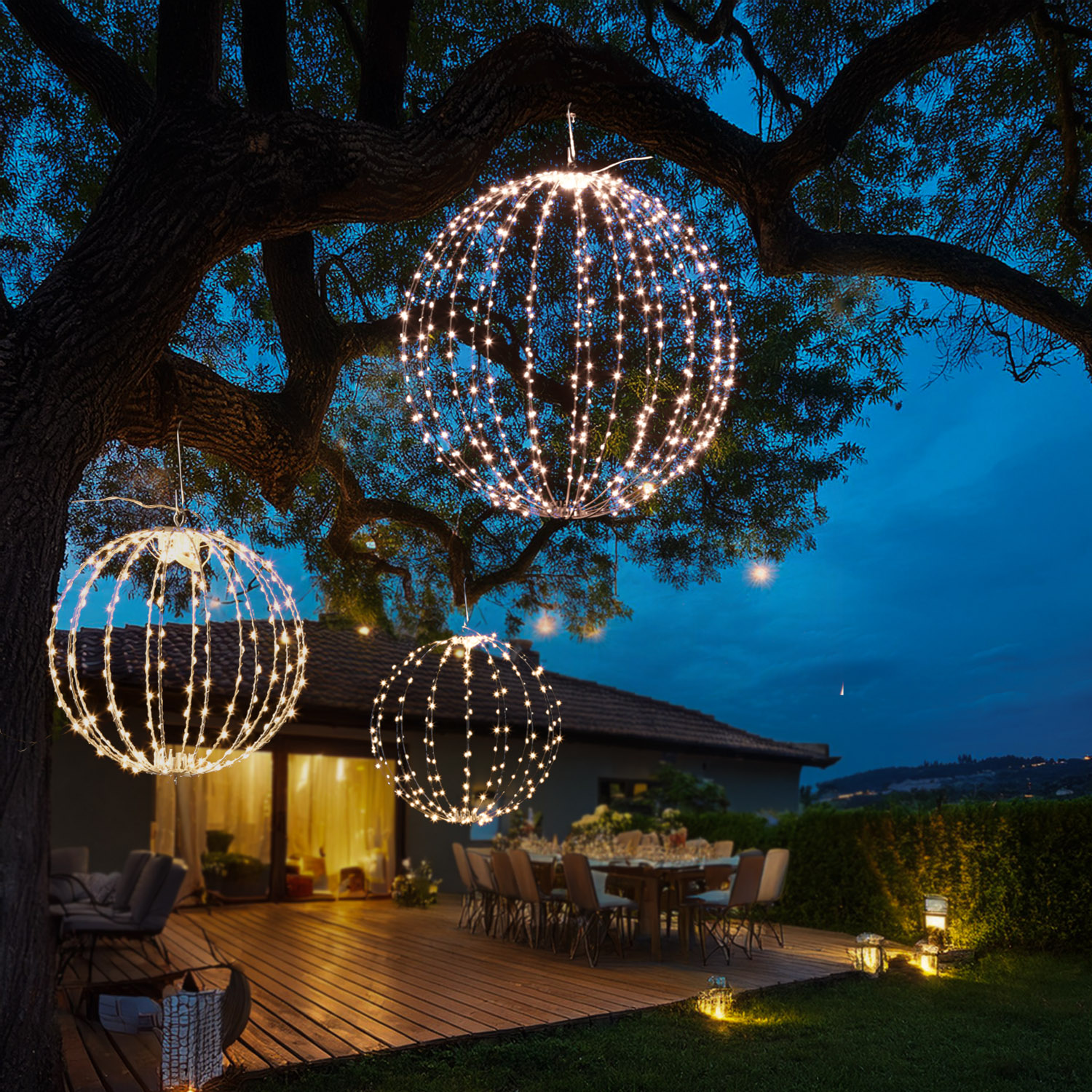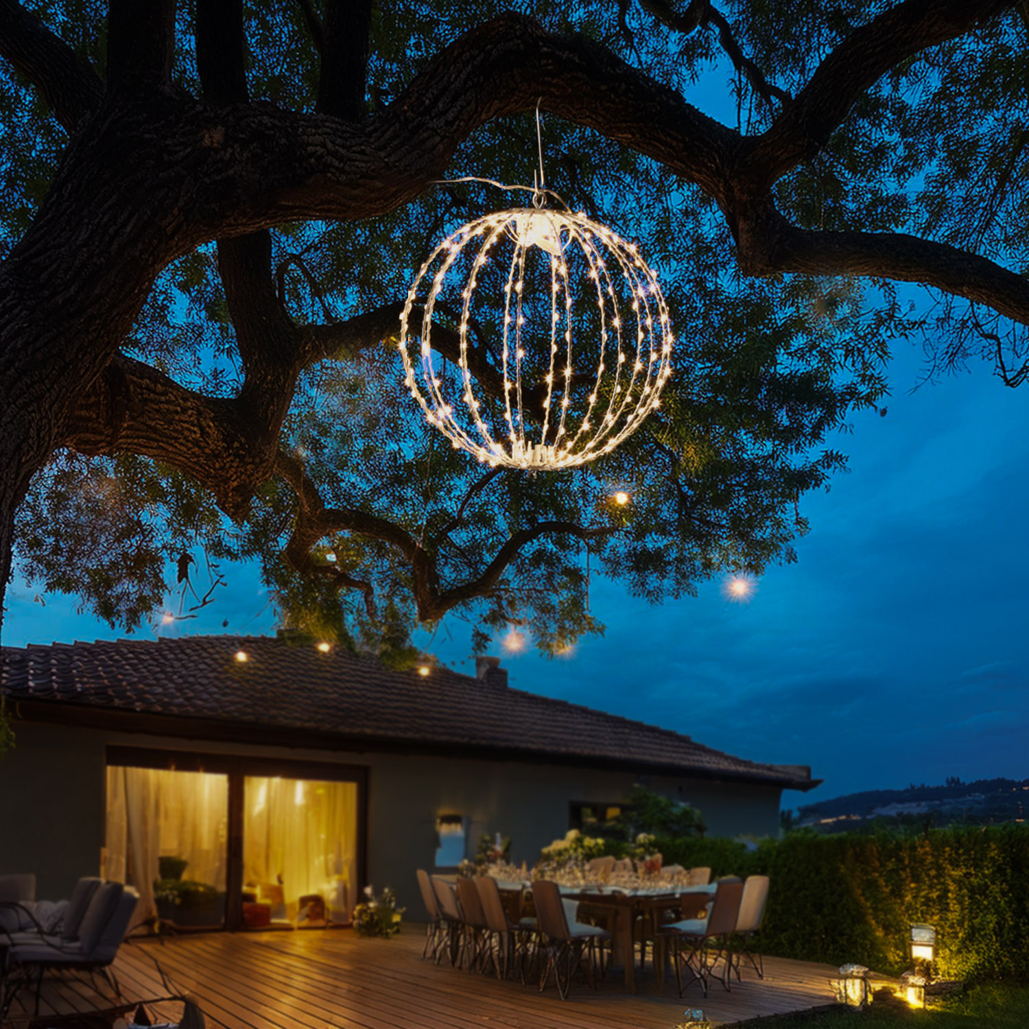 Die silberne Drahtlichterkette, die um die Streben gewickelt wurde, hat insgesamt 240 leuchtende warmweiße Micro LED. Diese erzeugen sie ein sanftes, harmonisches Licht, das Wärme, Geborgenheit und Eleganz ausstrahlt. Ob als schwebender Glanzpunkt über dem Esstisch, als romantisches Highlight im Garten oder als festliche Dekoration bei besonderen Anlässen - diese 3D Leuchtkugel sorgt immer für den perfekten Moment.