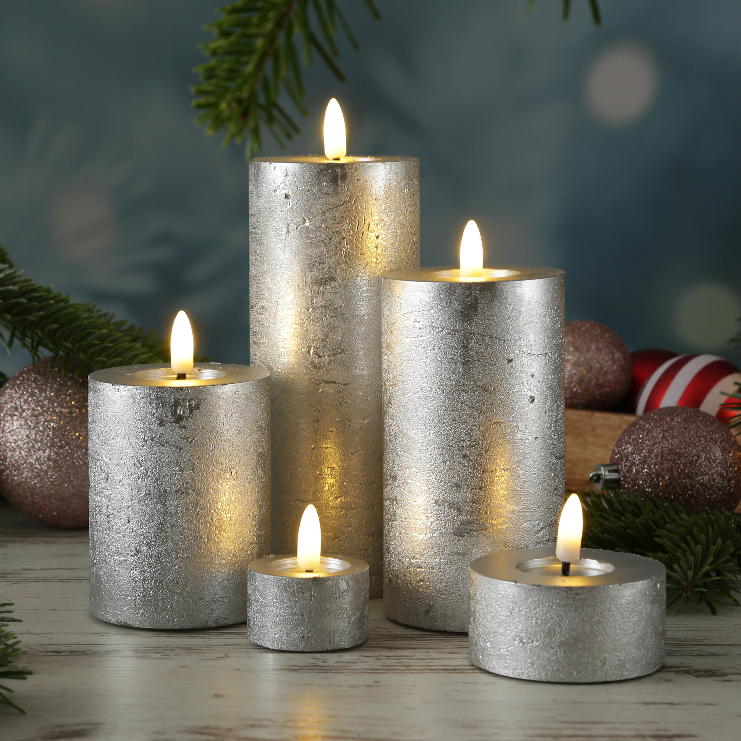 LED Kerze LINA - Rustik-Optik - Echtwachs - 3D Flamme - H: 15cm - D: 7cm - Batterie - Timer - silber