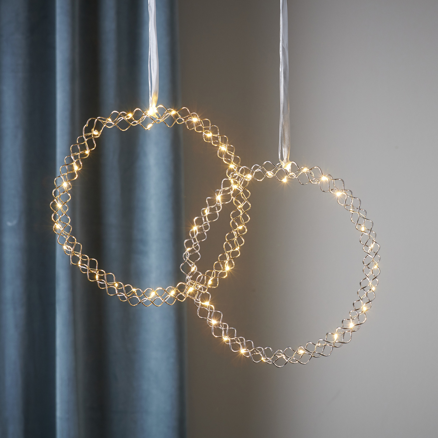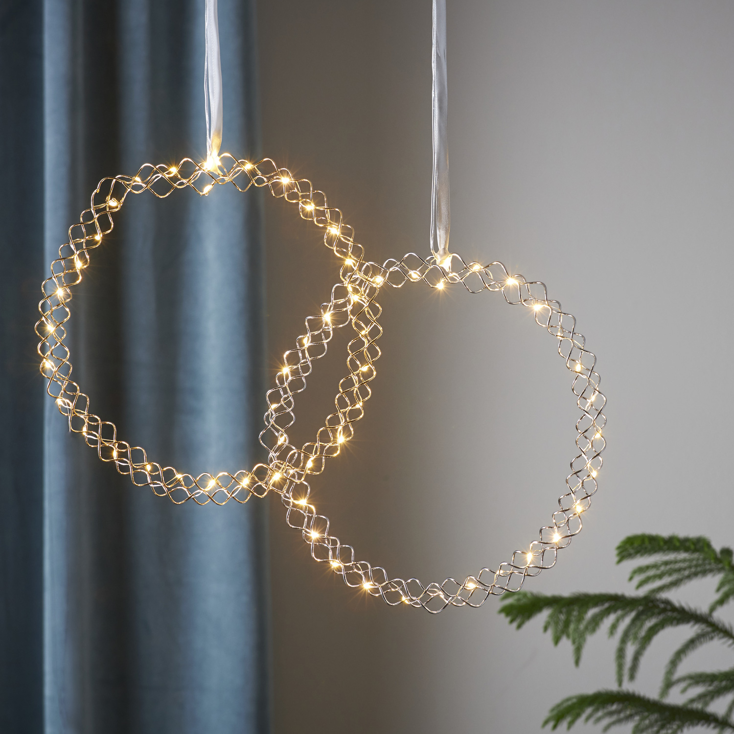 Wunderschöner Kranz aus feinem, silberfarbenem Draht, der mit 30 warmweißen LED bestückt ist. Der Kranz eignet sich sowohl als Fensterschmuck, Türschmuck oder für die Wand. Du kannst ihn ebenso als dekorativen Tischkranz (zum Beispiel um eine schöne Glasschale herum) einsetzen.