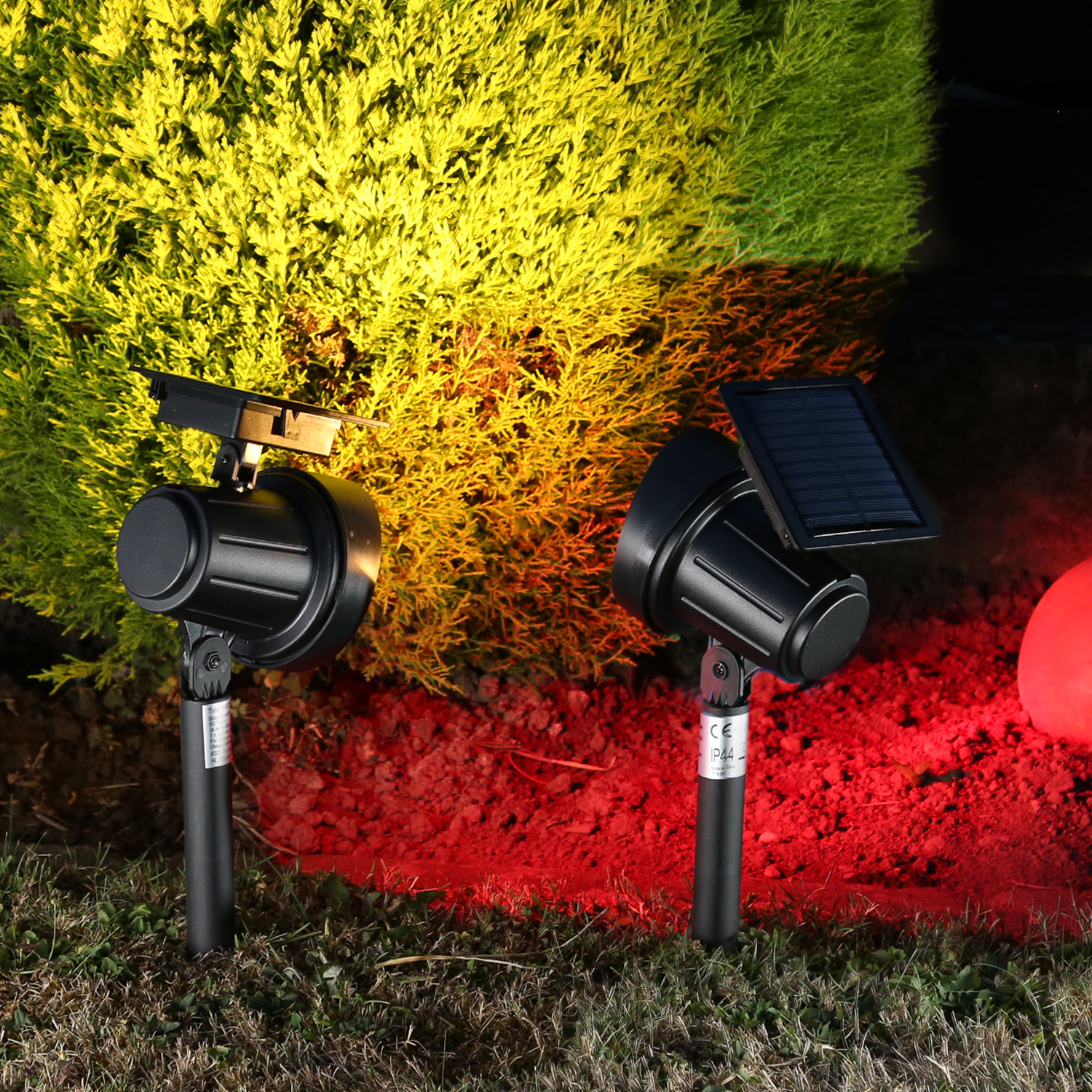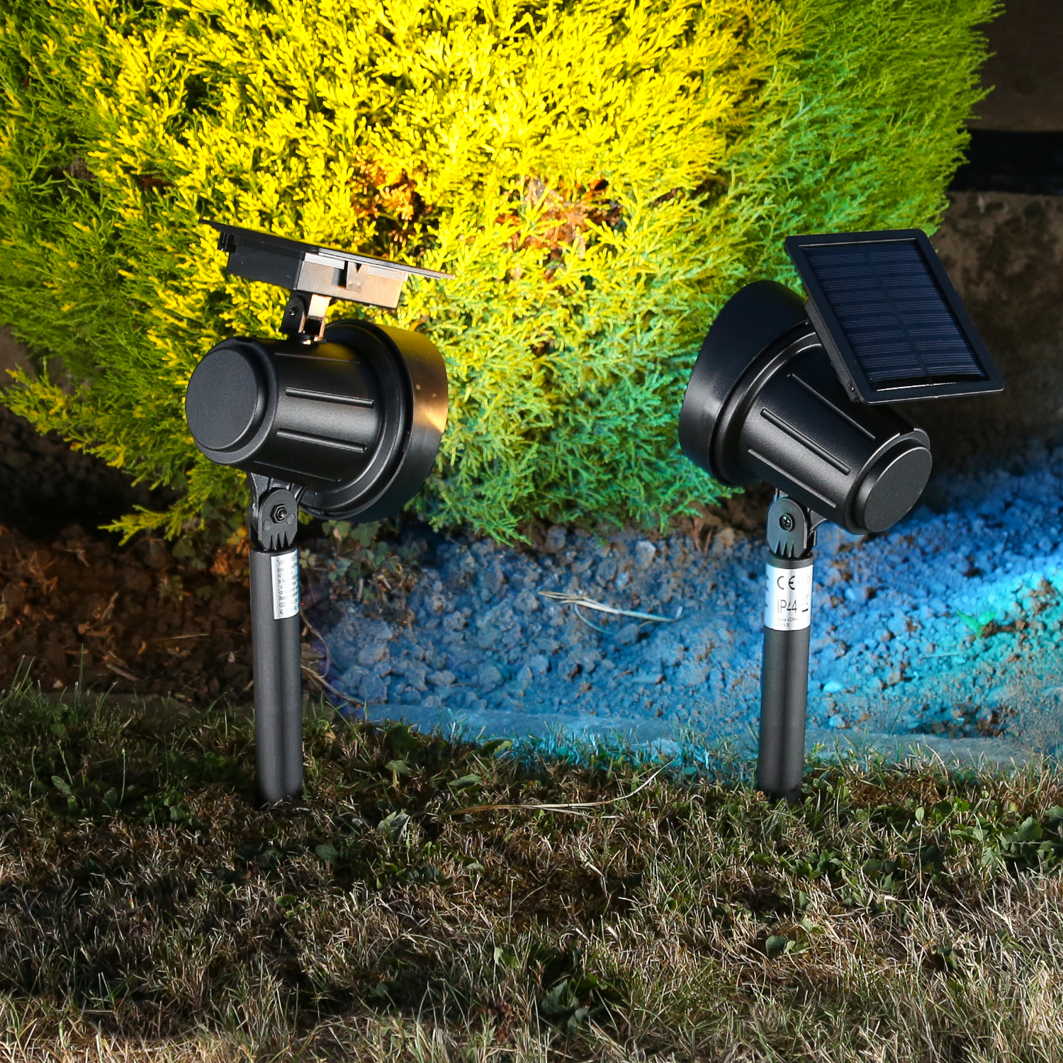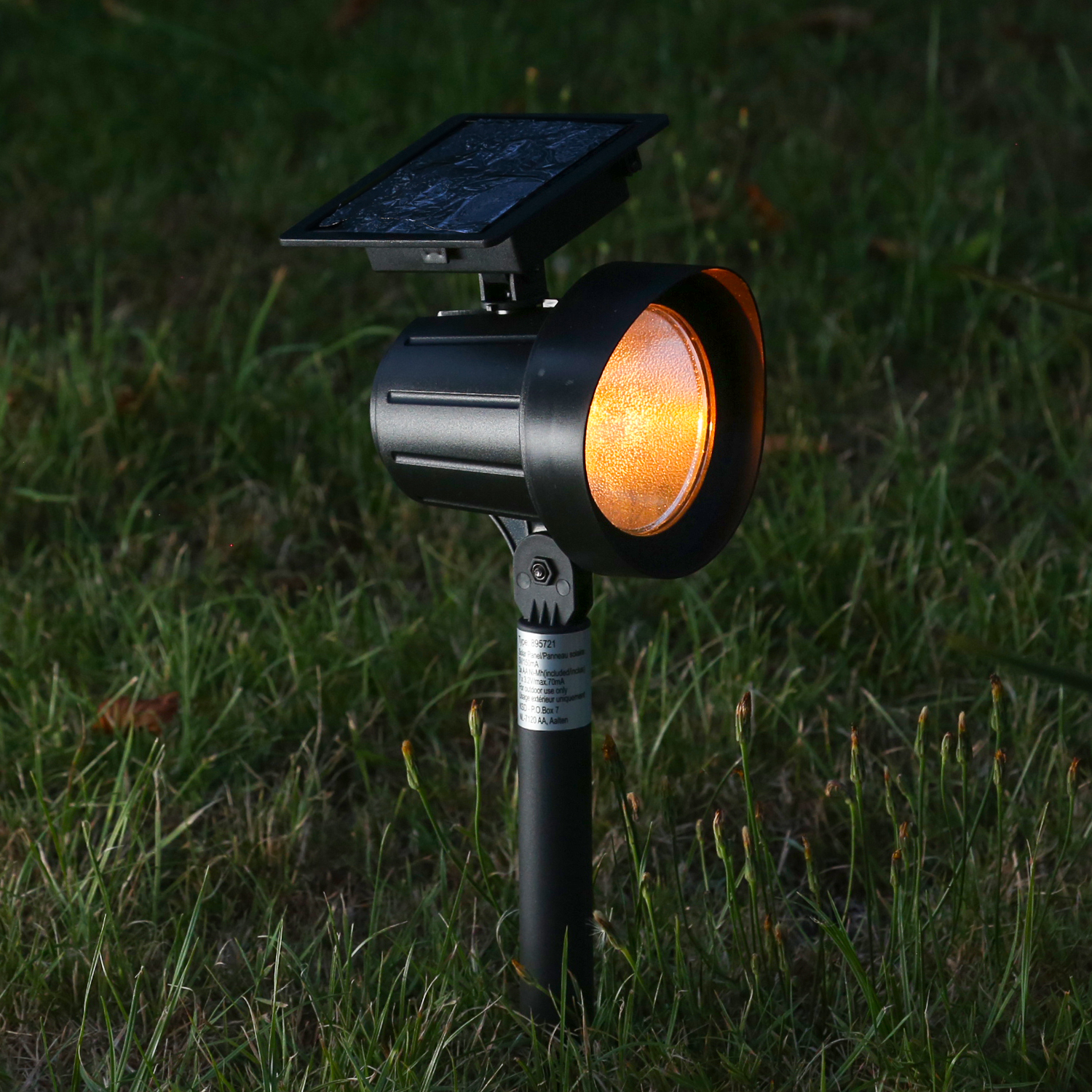 Die Scheinwerfer werden mit dem Erdspieß einfach in den Boden gesteckt. Die Sonne lädt den Akku über das Solarfeld auf und sobald die Dämmerung einsetzt, schaltet der Sensor die Spots an.