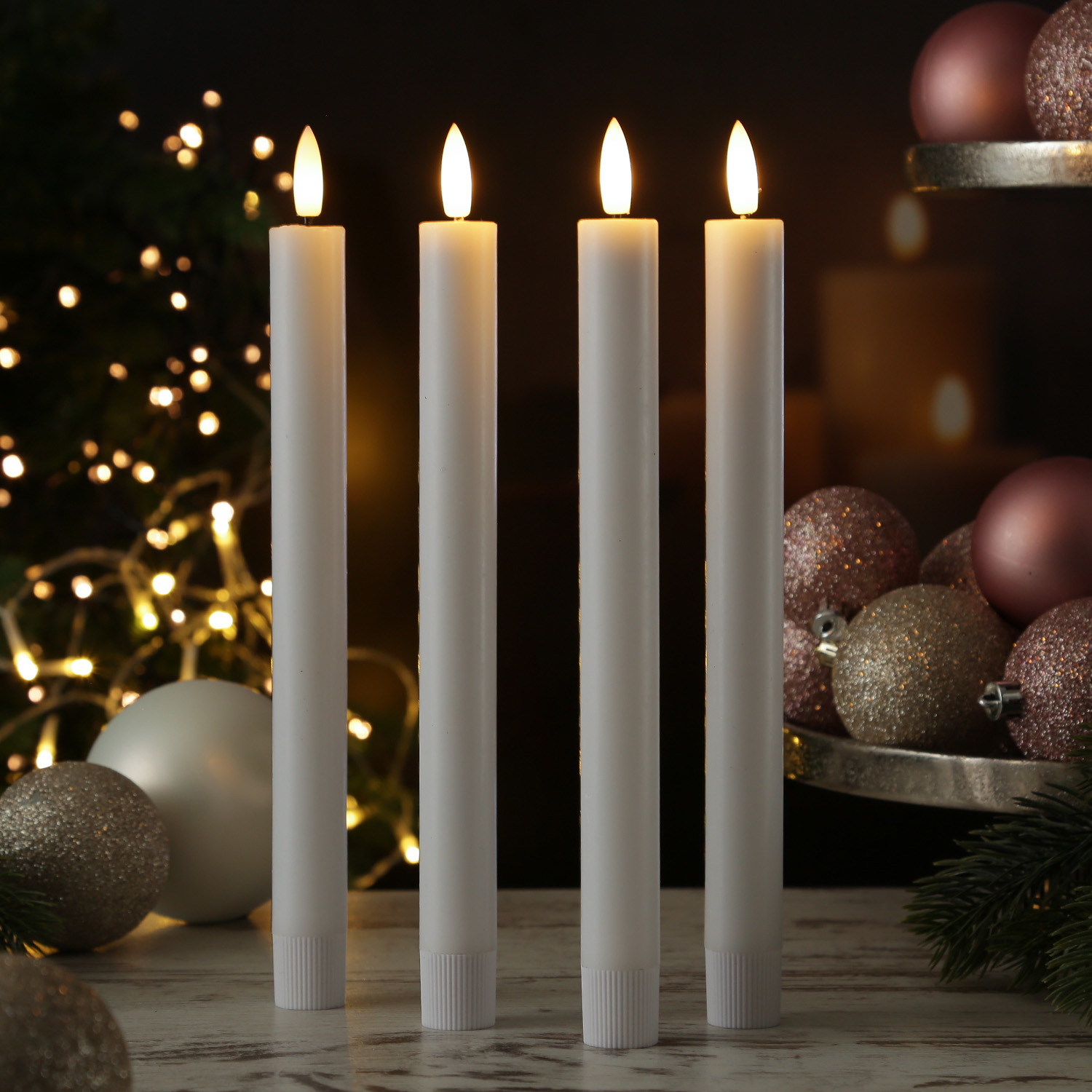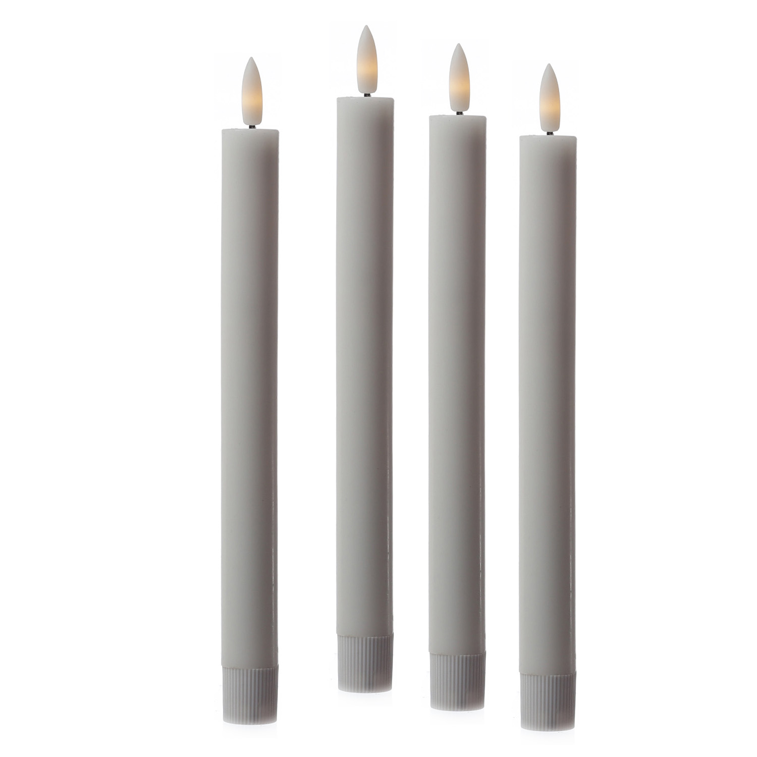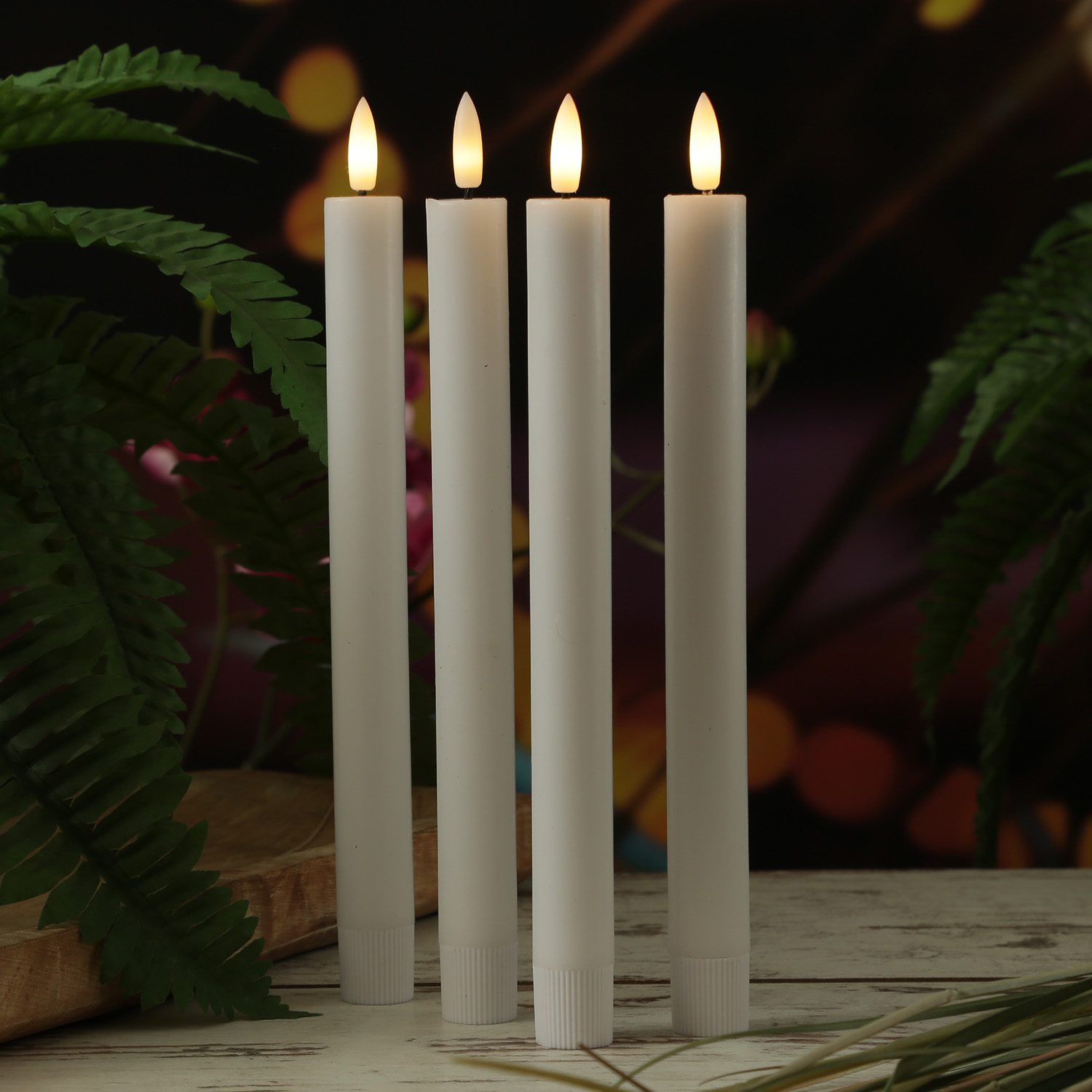 Diese 4 LED Tafelkerzen leuchten in einem realistischen warmweißen Farbton. Die 3D Flamme zeigt ein leichtes Flackern, das eine romantische und gemütliche Atmosphäre erzeugt. Der Schaft der LED Stabkerzen ist aus Echtwachs und sieht so täuschend echt aus.