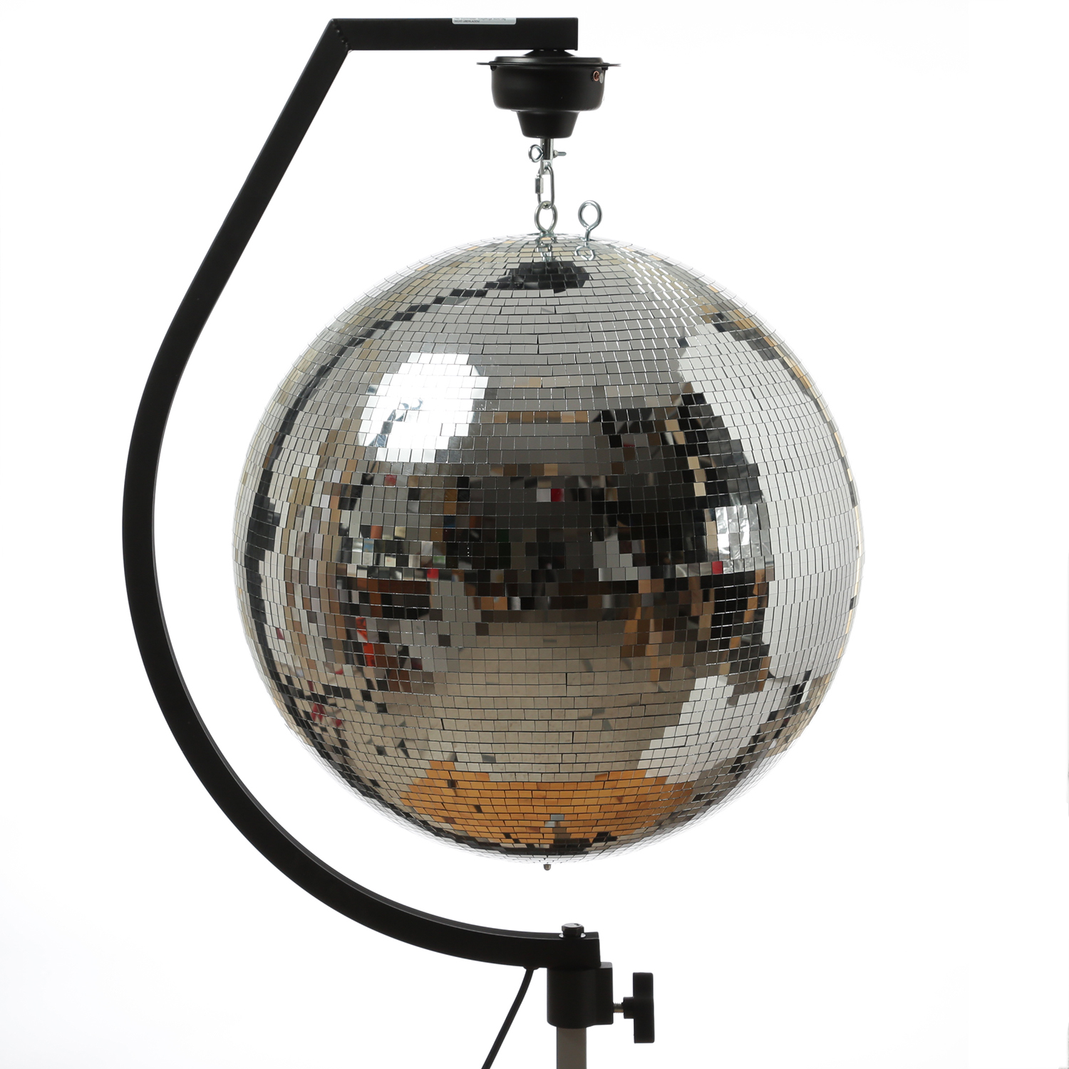 Es muss nicht immer die Decke sein. Mit dieser äußerst praktischen Stativhalterung kannst Du eine Spiegelkugel bis zu 50cm bequem an einem Stativ, dem DJ Tisch oder einer Traversensäule montieren. Der Motor ist hierbei bereits eingebaut. Nur noch Kugel einhängen und Stecker rein - läuft.