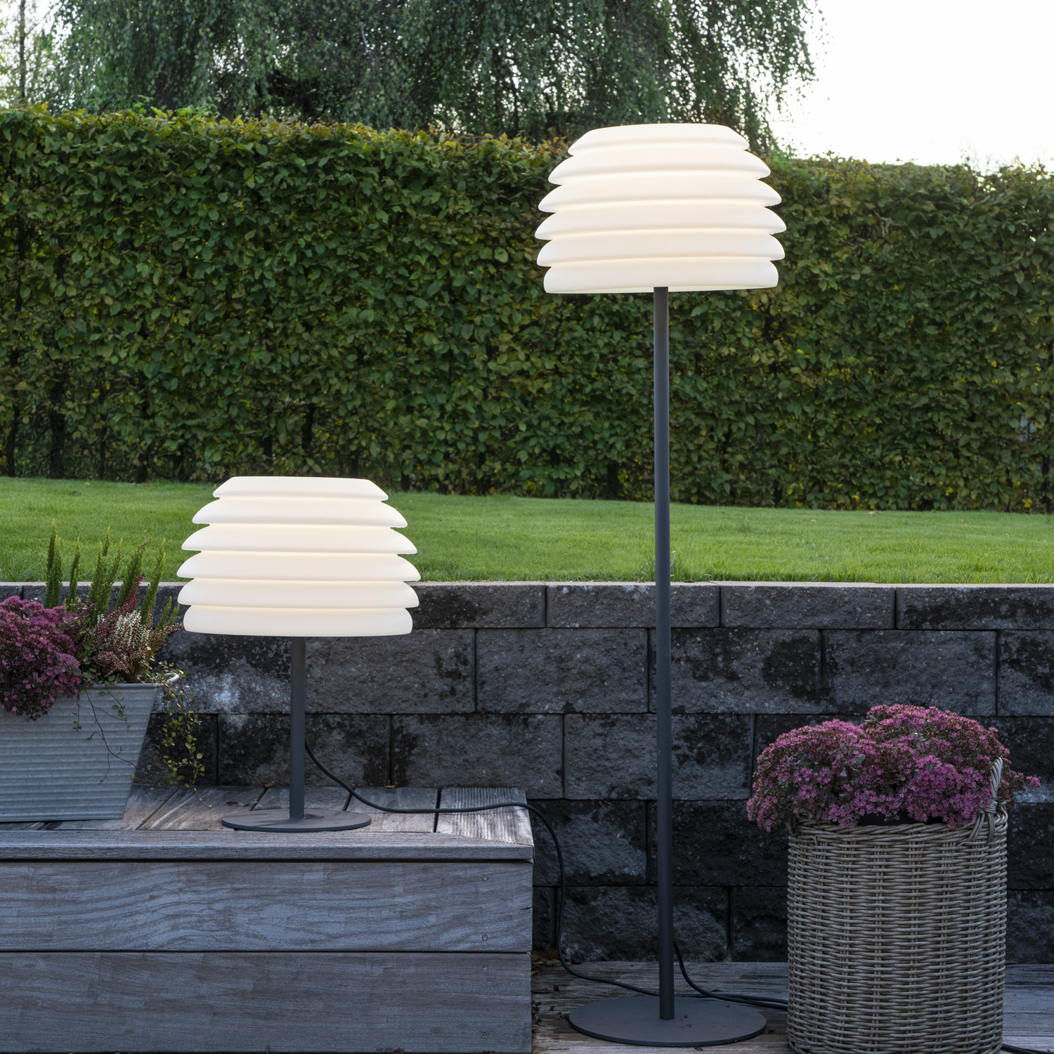 Die Leuchten sind für die Verwendung im Freien geeignet und halten auch einen Regenschauer aus. Die E27 Fassung ist vorzugsweise für energiesparende LED Leuchtmittel gedacht. Der Sockel fasst Lampen bis zu 40W mit einer Höhe von 14cm.